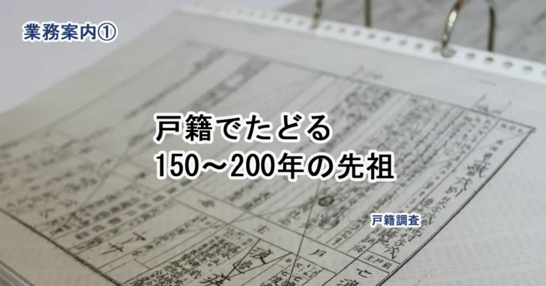 業務案内 目次 はじめての方へ|業務案内まとめ 戸籍調査(約150〜200年) 戸籍以上の調査(約400〜1000年) 巻物・折本・掛軸・額装 家系図冊子製本 ご相談から納品までの流れ よくあるご質問(Q&A) … 続きを読む 戸籍調査
